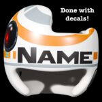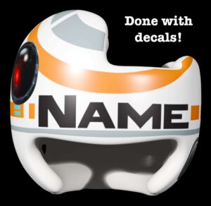 This BB8 decal design looks great on a white (we will adjust colors as needed) helmet, and we now offer complete helmet painting kits. Please also see our helmet painting instruction page.