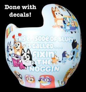 How to apply the Bluey cranial band decals – watch me decorate an entire helmet. Do you have a Star Band covered in holes? I use a mix and match of two strategies. One is pick a design with smaller elements that fit around the holes, and the second is just not worry about them. Some folks ‘paper over’ the holes, but I just cut a hole in the decal that is covering the hole. Yes, up close you ‘see’ it, but most of the time you (and other folks) are several feet away and your eyes fill in the missing part.