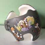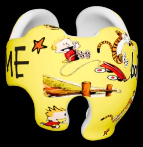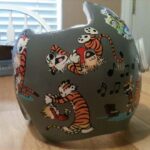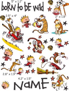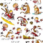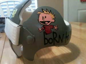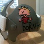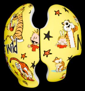 Calvin & Hobbes cranial band decoration decals! It captures the theme with images and quotes. This is an approximately 8.5″ x 11″ sheet of high quality vinyl die cut decals. Show your passion for these classic friends with the characters playing and acting out many of their favorite scenes and decorate your doc band or full helmet. The sheet will be more than enough to completely decorate any brand of plagiocephaly helmet, and the decals will stick to all brands of plagiocephaly helmet but we do recommend a light sanding with 400 grit sandpaper because some bands have a slick coating that won’t wash off.