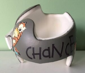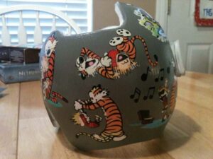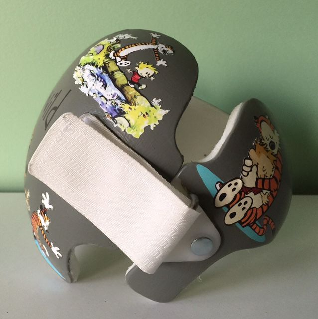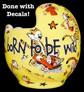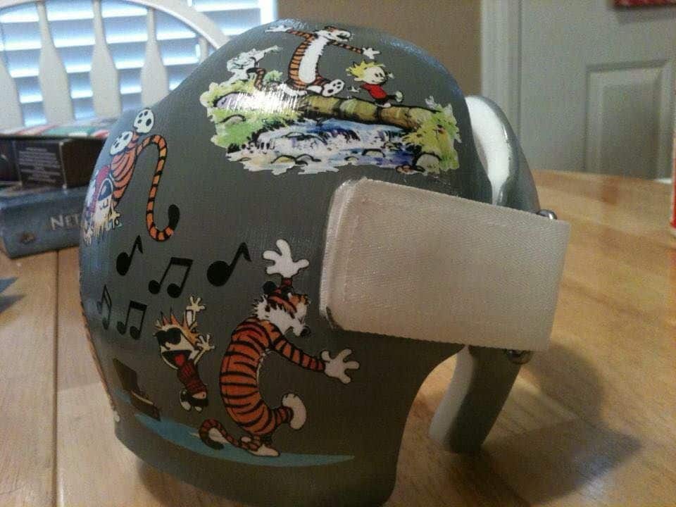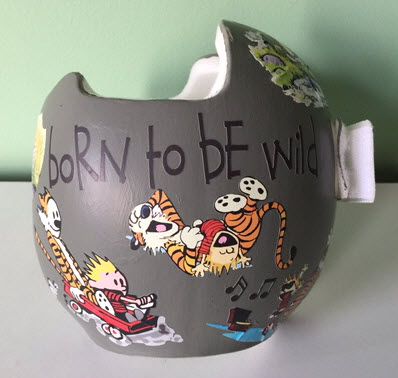 How to apply the Calvin & Hobbes cranial band decals – watch me decorate an entire helmet. Do you have one of the new Star Band 3D’s covered in small holes?  What can you do?  I recommend you pick a design with medium to larger decals and just ‘paper over’ the holes that get covered..  Then mod podge as you would any other band.  Yes, up close you ‘see’ it, but most of the time you (and other folks) are several feet away and your eyes fill in the missing part.