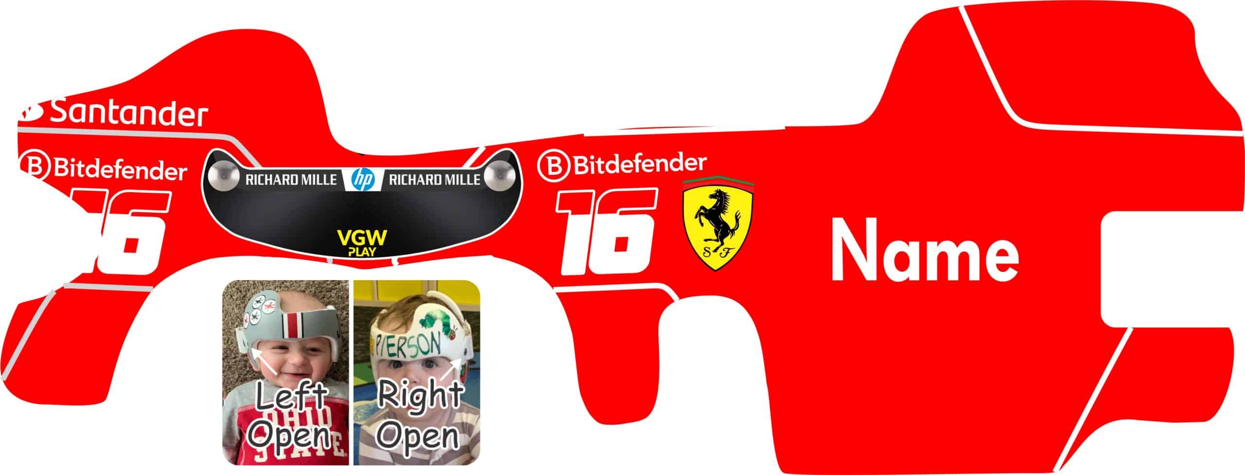 Some folks ask about wrapping full helmets but we can’t in good conscience recommend a wrap for full helmets.  They have more curvature around the top compared to a doc band.  We can guarantee an experienced installer can install the wrap on a doc band and have it lay flat but we can’t make that guarantee for full helmets.  We have a Charles Lecleric Ferrari cranial band design you can apply to full sized plagiocephaly helmets like Star Bands / Boston Bands, and Danmar helmets.