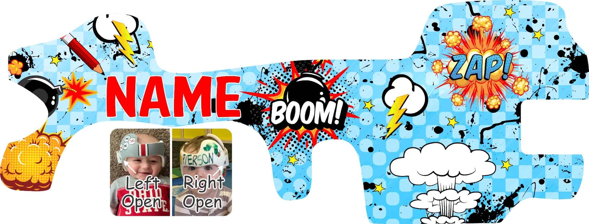 Comic Book retro super hero Doc Band Wrap! WE RECOMMEND YOU ONLY ORDER THIS DESIGN IF YOU HAVE A DOC BAND. Full helmet styles are very difficult to wrap and you might not get good results.