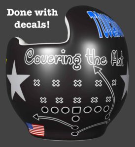 How to apply the Covering the Flat football cranial band decals – watch me decorate an entire helmet. Do you have one of the new Star Band 3D’s covered in small holes?  What can you do?  I recommend you pick a design with medium to larger decals and just ‘paper over’ the holes that get covered..  Then mod podge as you would any other band.  Yes, up close you ‘see’ it, but most of the time you (and other folks) are several feet away and your eyes fill in the missing part.