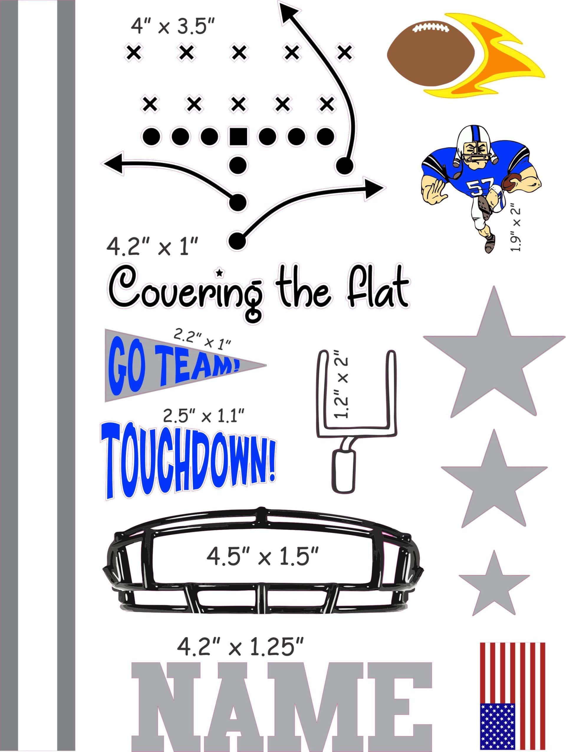 The Covering the Flat football play sticker sheet is printed just for you and the style is very popular. Each design is separate but all the designs will come on one sheet, and you will cut them apart to apply them.  Generally the text should be applied line by line or as one block.