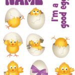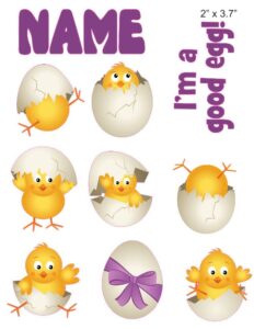 Easter 3 themed cranial band decoration decals for baby helmets! This is an approximately 8.5″ x 11″ sheet of high quality vinyl die cut decals. We cut around the shapes, so no clunky white space. We also use a full color vinyl printer, so all designs are printed correctly. No layering/stacking of vinyl to build the complete design!