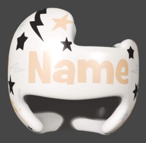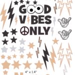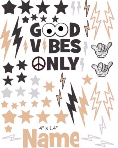 Good Vibes Only cranial band decoration decals! It captures the theme with starts and lightning bolts in neutral colors and a large Good Vibes Only quote. You get an 8.5″ x 11″ sheet of high quality vinyl die cut decals. The sheet will be more than enough to completely decorate any brand of plagiocephaly helmet, and the decals will stick to all brands of plagiocephaly helmet but we do recommend a light sanding with 400 grit sandpaper because some bands have a slick coating that won’t wash off.