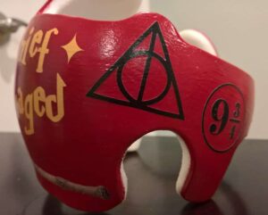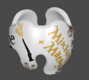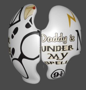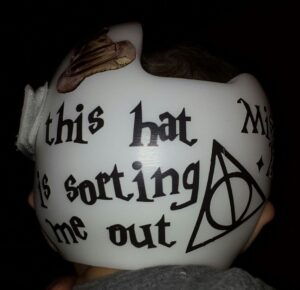 Harry Potter themed cranial band decoration decals! It captures the theme with images and quotes. You get an approximately 8.5″ x 11″ sheet of high quality vinyl die cut decals. Show your passion for Harry Potter with these symbols and the collection of Hogwarts quotes and decorate your doc band or full helmet. The sheet will be more than enough to completely decorate any brand of plagiocephaly helmet, and the decals will stick to all brands of plagiocephaly helmet but we do recommend a light sanding with 400 grit sandpaper because some bands have a slick coating that won’t wash off.