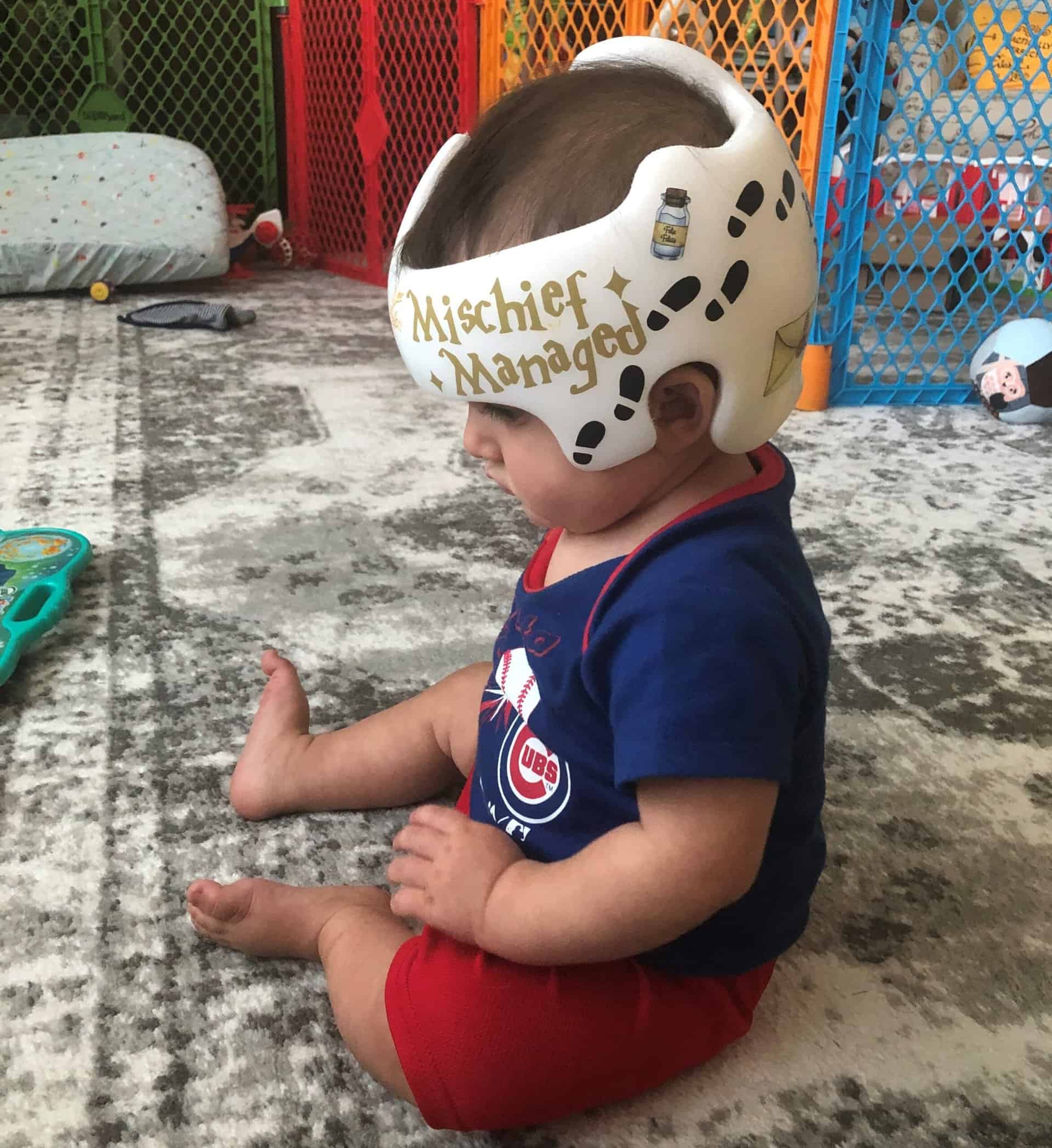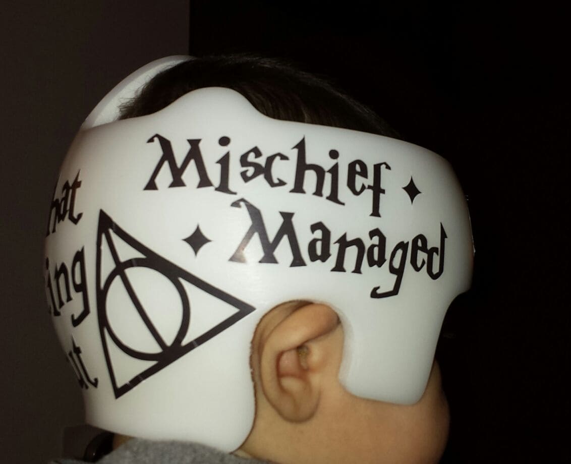 Harry Potter themed cranial band decoration decals! It captures the theme with images and quotes. You get an approximately 8.5″ x 11″ sheet of high quality vinyl die cut decals. Show your passion for Harry Potter with these symbols and the collection of Hogwarts quotes and decorate your doc band or full helmet. The sheet will be more than enough to completely decorate any brand of plagiocephaly helmet, and the decals will stick to all brands of plagiocephaly helmet but we do recommend a light sanding with 400 grit sandpaper because some bands have a slick coating that won’t wash off.