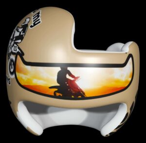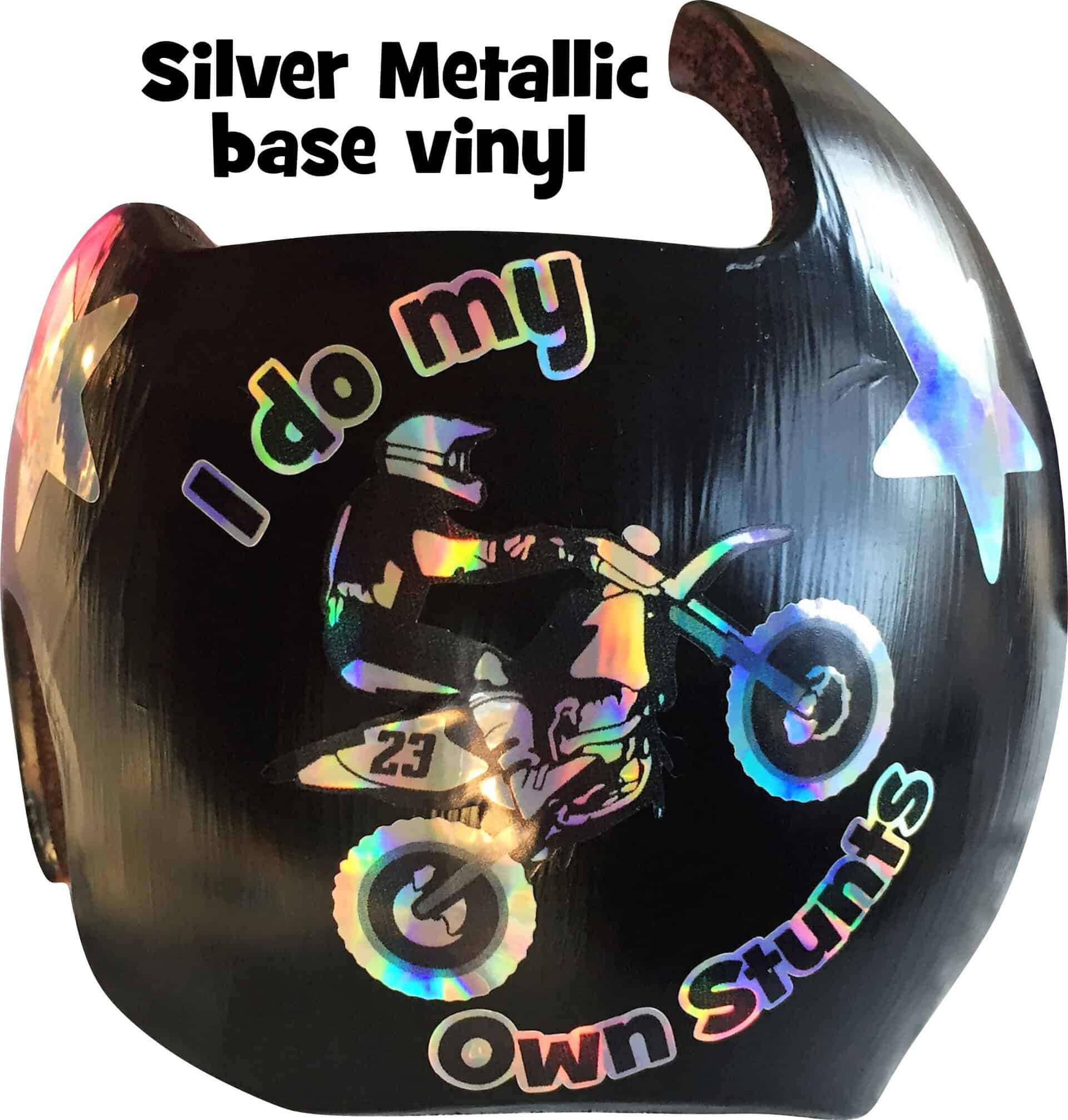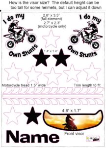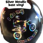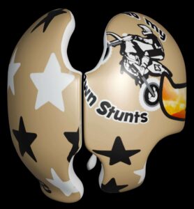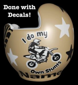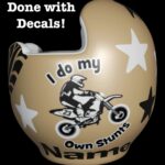 How to apply the I Do My Own Stunts motorcycle cranial band decals – watch me decorate an entire helmet. Do you have one of the new Star Band 3D’s covered in small holes? What can you do? I recommend you pick a design with medium to larger decals and just ‘paper over’ the holes that get covered.. Then mod podge as you would any other band. Yes, up close you ‘see’ it, but most of the time you (and other folks) are several feet away and your eyes fill in the missing part.