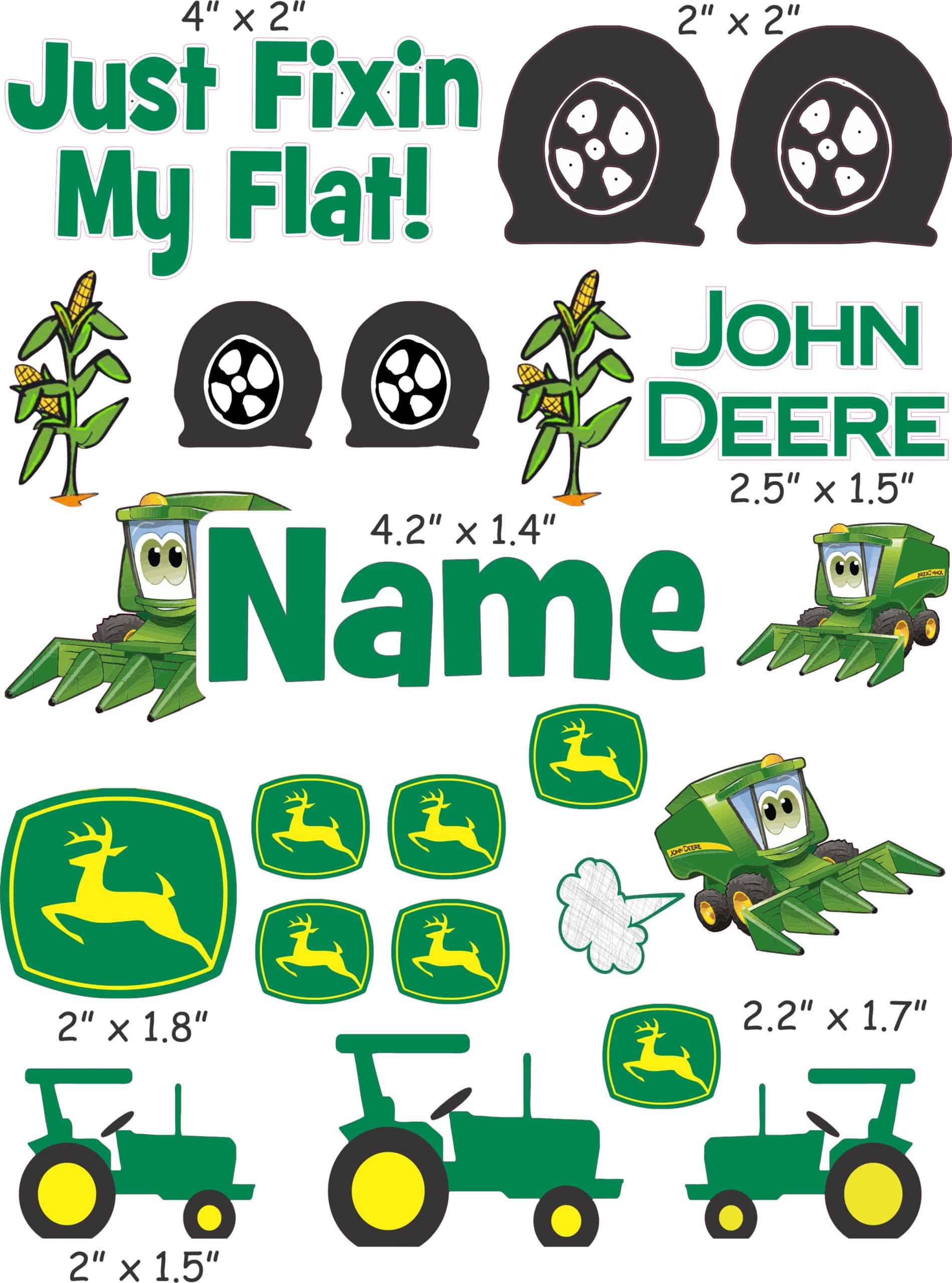 The John Deere sticker sheet is printed just for you and the style is very popular. Each design is separate but all the designs will come on one sheet, and you will cut them apart to apply them.  Generally the text should be applied line by line or as one block.