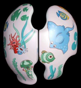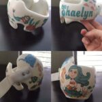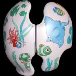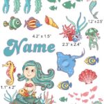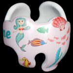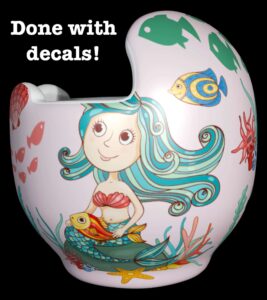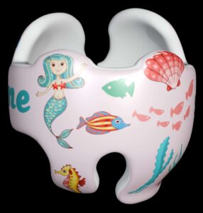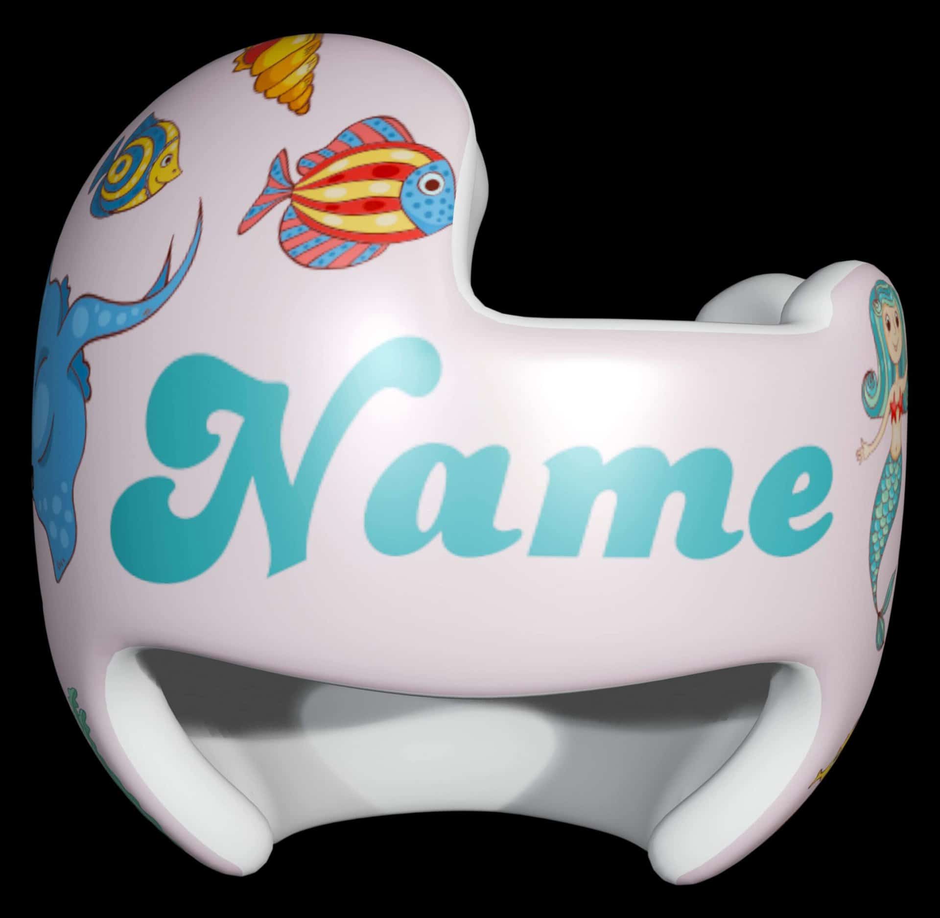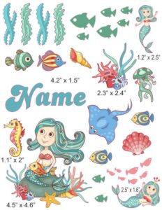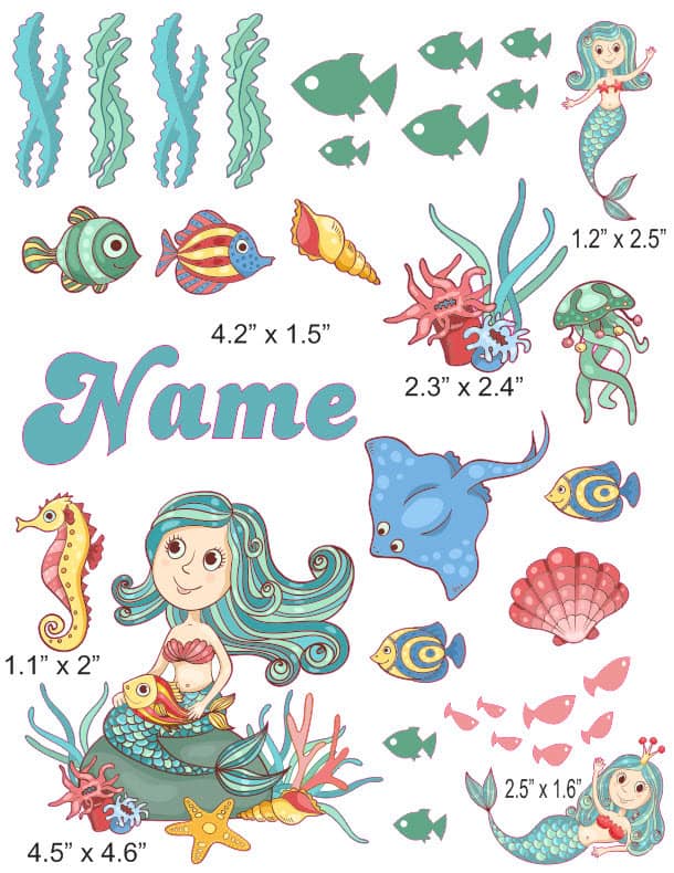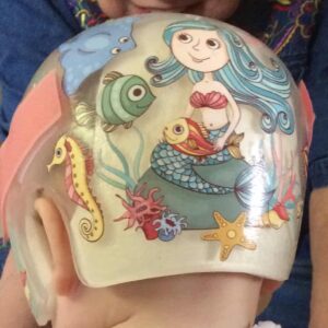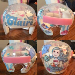 Mermaid cranial band decoration decals! It captures the theme with mermaids and fish and sea life. You get an 8.5″ x 11″ sheet of high quality vinyl die cut decals.  The sheet will be more than enough to completely decorate any brand of plagiocephaly helmet, and the decals will stick to all brands of plagiocephaly helmet but we do recommend a light sanding with 400 grit sandpaper because some bands have a slick coating that won’t wash off.