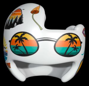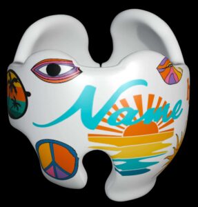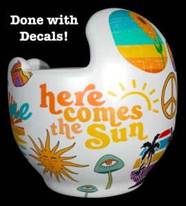 How to apply the Retro Sunshine cranial band decals – watch me decorate an entire helmet. Do you have a Star Band covered in holes? I use a mix and match of two strategies. One is pick a design with smaller elements that fit around the holes, and the second is just not worry about them. Some folks ‘paper over’ the holes, but I just cut a hole in the decal that is covering the hole. Yes, up close you ‘see’ it, but most of the time you (and other folks) are several feet away and your eyes fill in the missing part.