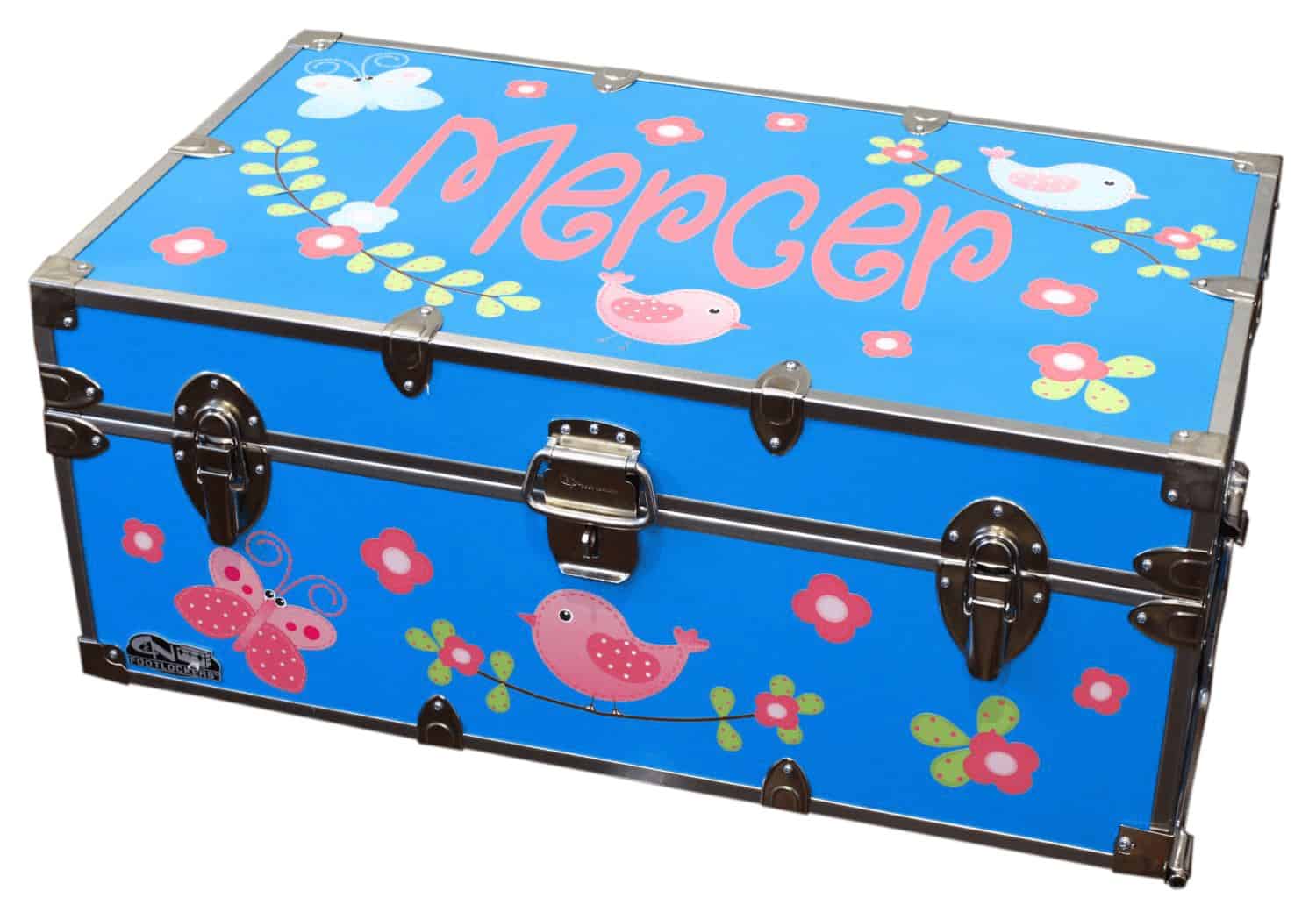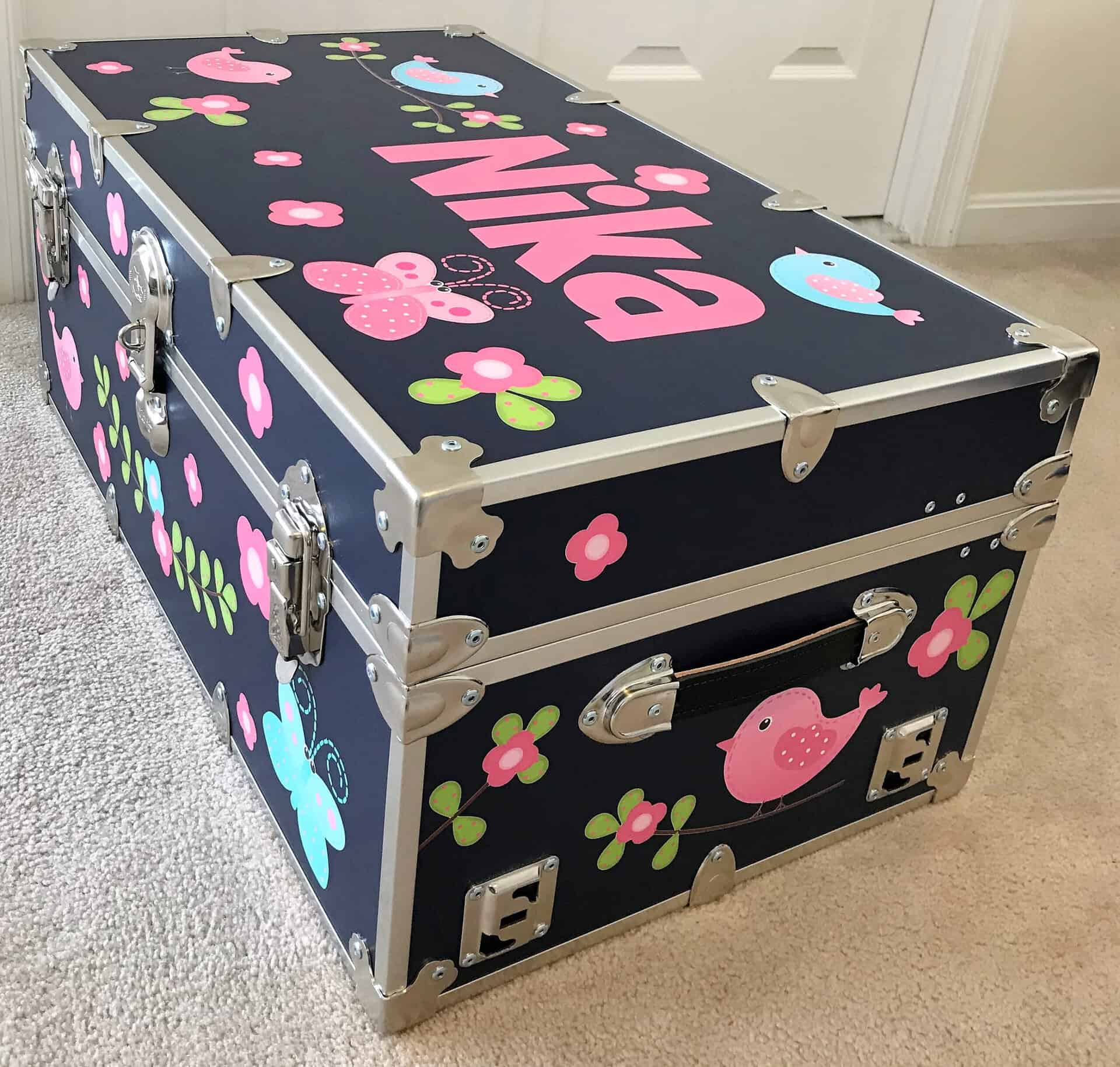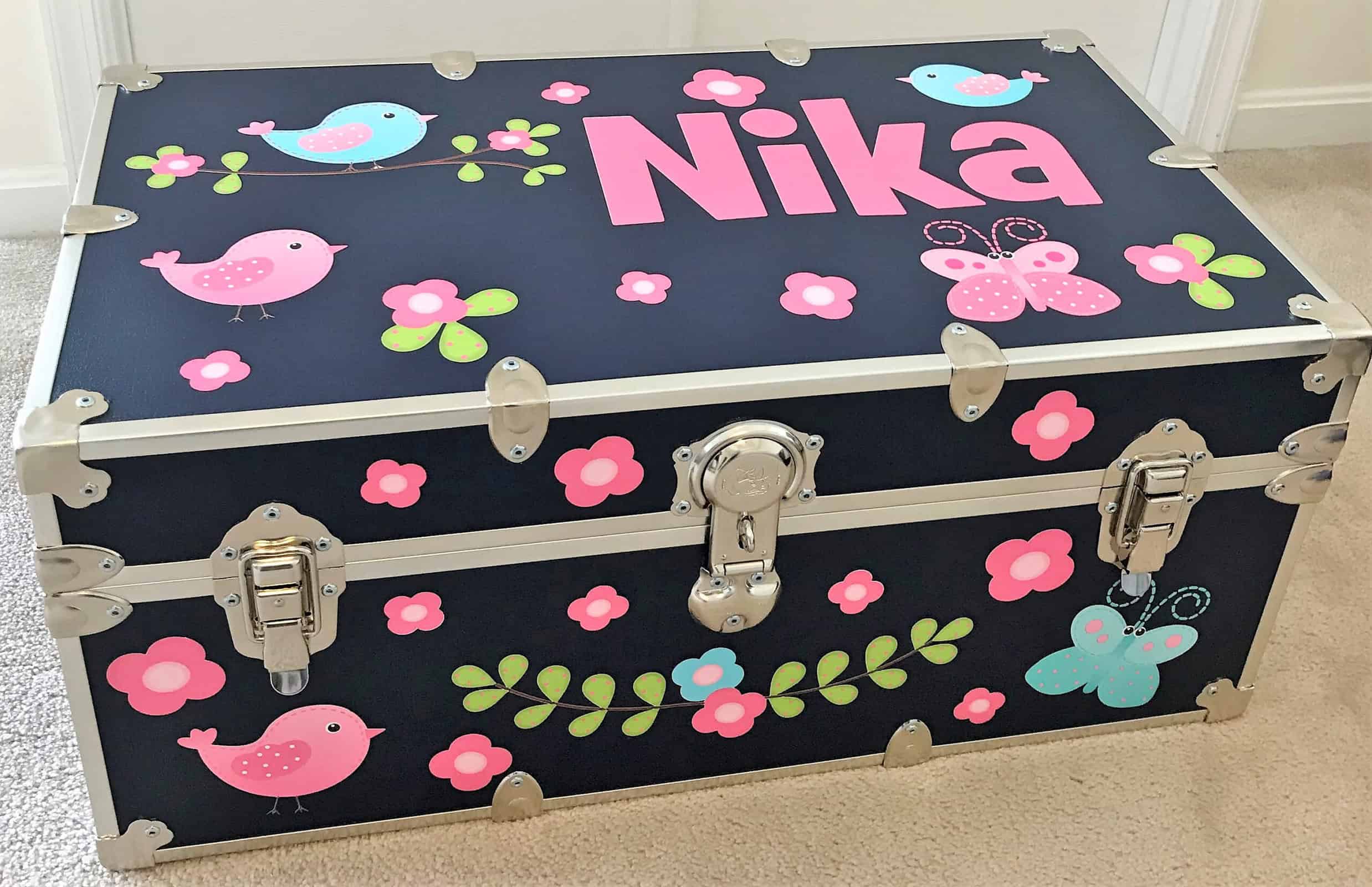 Personalize your summer camp trunk with these Spring Birds?vinyl decals. The design you see is on a 28″ x 23″ wide canvas, so you get a ton of decals and value for your money! Why buy our personalized camp trunk decals?