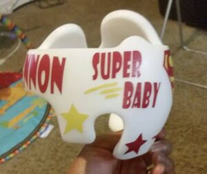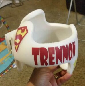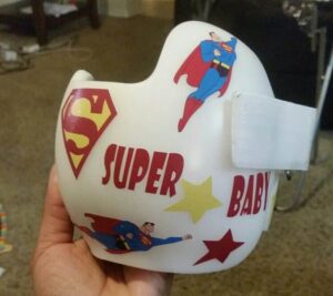 How to apply the Super Baby cranial band stickers – watch me decorate an entire helmet. Do you have one of the new Star Band 3D’s covered in small holes? What can you do? I recommend you pick a design with medium to larger decals and just ‘paper over’ the holes that get covered.. Then mod podge as you would any other band. Yes, up close you ‘see’ it, but most of the time you (and other folks) are several feet away and your eyes fill in the missing part.