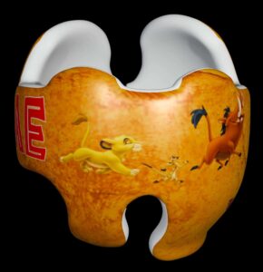 Some folks ask about wrapping full helmets but we can’t in good conscience recommend a wrap for full helmets.  They have more curvature around the top compared to a doc band.  We can guarantee an experienced installer can install the wrap on a doc band and have it lay flat but we can’t make that guarantee for full helmets.  We have several The Lion King cranial band designs for those helmets.