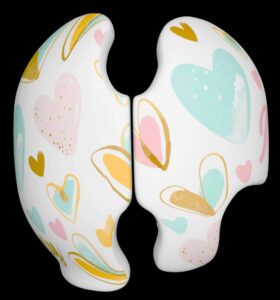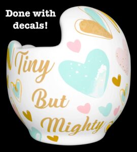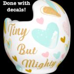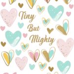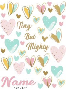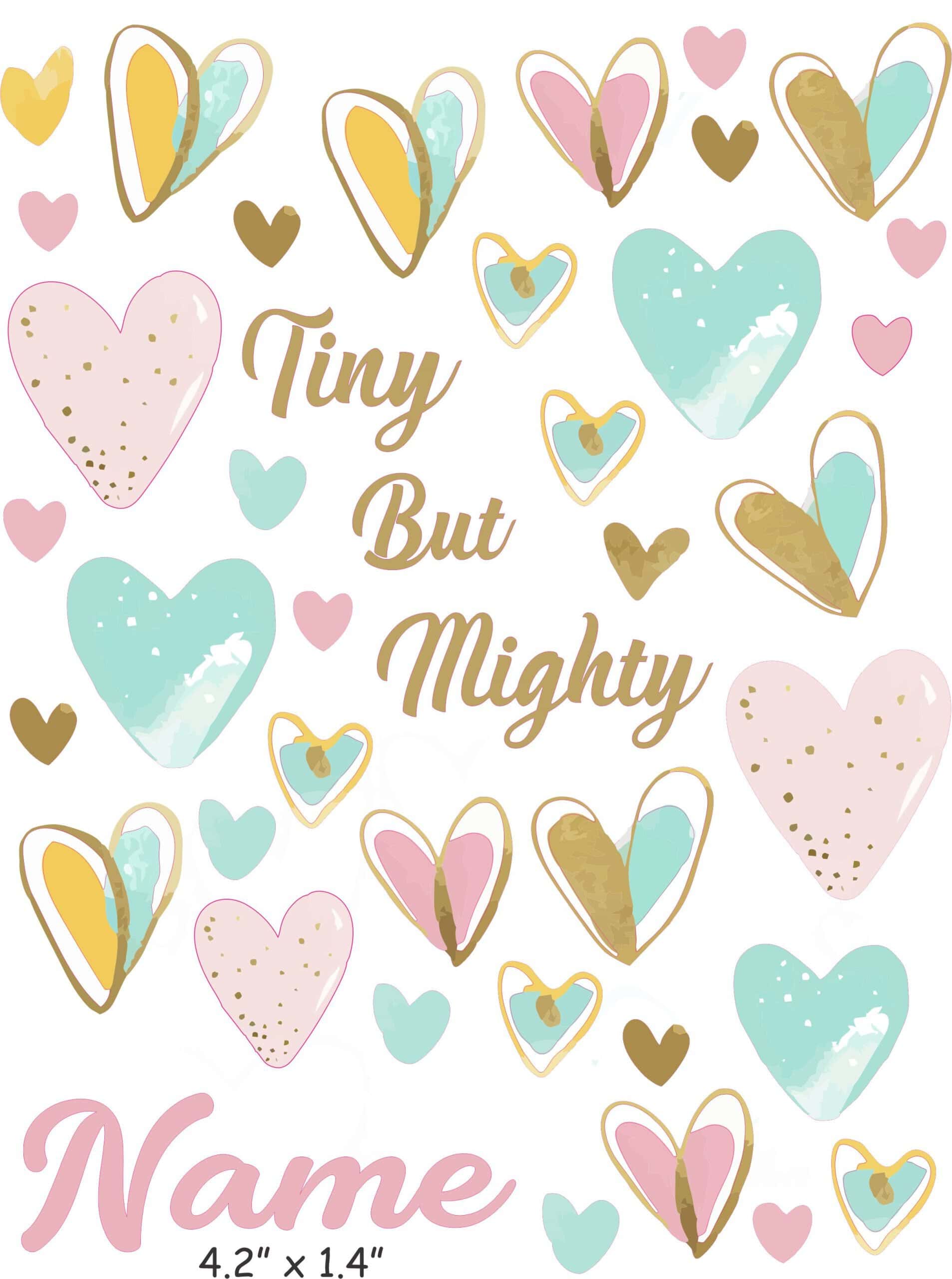 Tiny but Mighty cranial band decoration decals! It captures the theme with multicolor hearts and a quote. You get an 8.5″ x 11″ sheet of high quality vinyl die cut decals. This collection will be more than enough to completely decorate any brand of plagiocephaly helmet, and the decals will stick to all brands of plagiocephaly helmet but we do recommend a light sanding with 400 grit sandpaper because some bands have a slick coating that won’t wash off.
