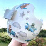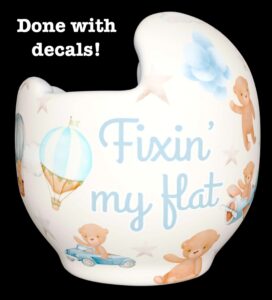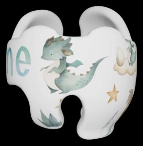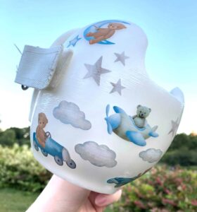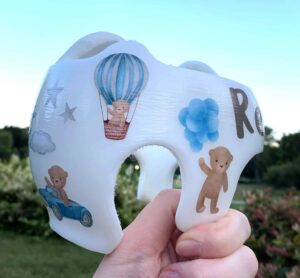 How to apply the Watercolor Hot Air Balloons cranial band decals – watch me decorate an entire helmet. Do you have one of the new Star Band 3D’s covered in small holes? What can you do? I recommend you pick a design with medium to larger decals and just ‘paper over’ the holes that get covered.. Then mod podge as you would any other band. Yes, up close you ‘see’ it, but most of the time you (and other folks) are several feet away and your eyes fill in the missing part.